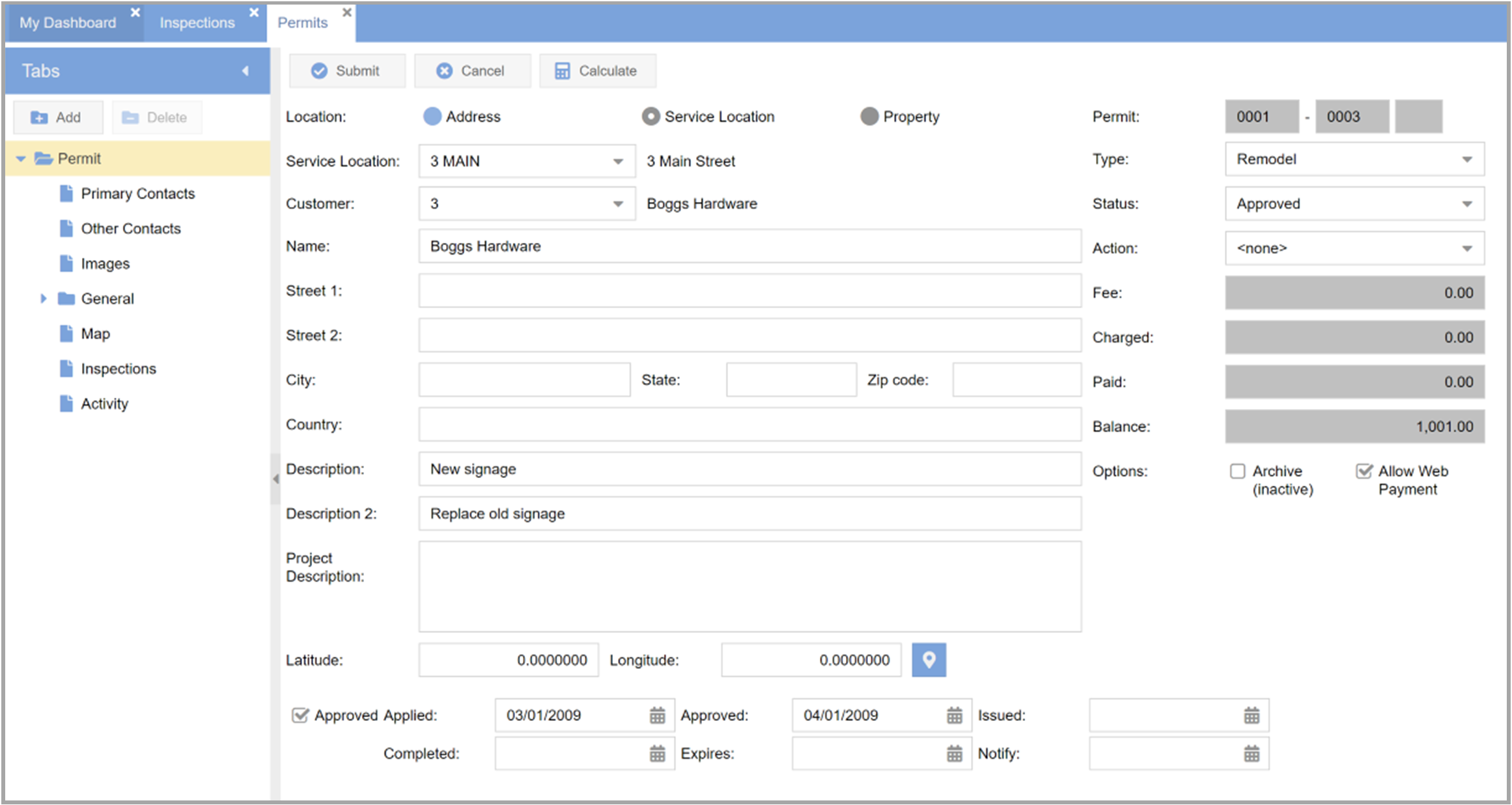 This versatile module lets you create your own categories of permits, and each category can have multiple types (such as Construction, Zoning, Remodel, and Demolition). It also lets you manage inspections for all permit types.